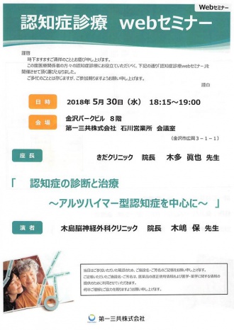 2018年05月31日(木) 認知症のウエブセミナーをしました! 認知症の講演をしました! 昨晩は製薬会社の会議室から、Webセミナーとして認知症の診断と治療の講演をしました。参加者が見えない状態でしゃべるのは、不思議な感じでした。 座長の木多先生は大学時代の学位指導教官でした。師弟コンビで講演できて嬉しいです。