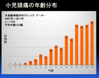 2007年~2017年に頭痛で当院を受診した19歳以下の患者さんの総人数は1752人でした。グラフは年齢別に表しています。平均年齢15.0歳で、14歳以降で人数が増えています。