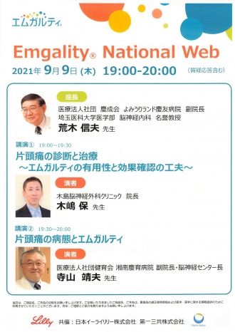 2021年09月09日(木) 全国配信の講演 今までは地域限定向けのWEB講演会で話をしてきましたが、本日は全国配信の講演で話をしました。 いままでより関係者の数も多く、ネット環境や照明、カメラも専門業者の方が担当してしました。 雰囲気が違い少し緊張しましたが、無事に終えることができ、ホッとしました。 この講演をきっかけに片頭痛の新しい薬(抗CGRP製剤)の恩恵を受ける患者さんが増え、頭痛に苦しんでいる患者さんが1人でも減ることを願っています。