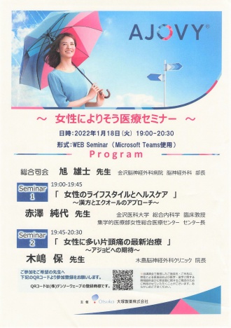 2022年01月18日(火) 女性にやさしい頭痛医療をめざして 今日は女性医療の視点から片頭痛の話をさせて頂きました。 月経時に起きる頭痛の6~7割は片頭痛で、女性ホルモン(エストロゲン)の変化が片頭痛を誘発していると言われています。月経時の頭痛を生理痛と思って市販薬を飲んでいませんか?市販薬で改善しない場合は、片頭痛の治療薬をお勧めします。初診はWEB予約できますので、お気軽にご相談ください。