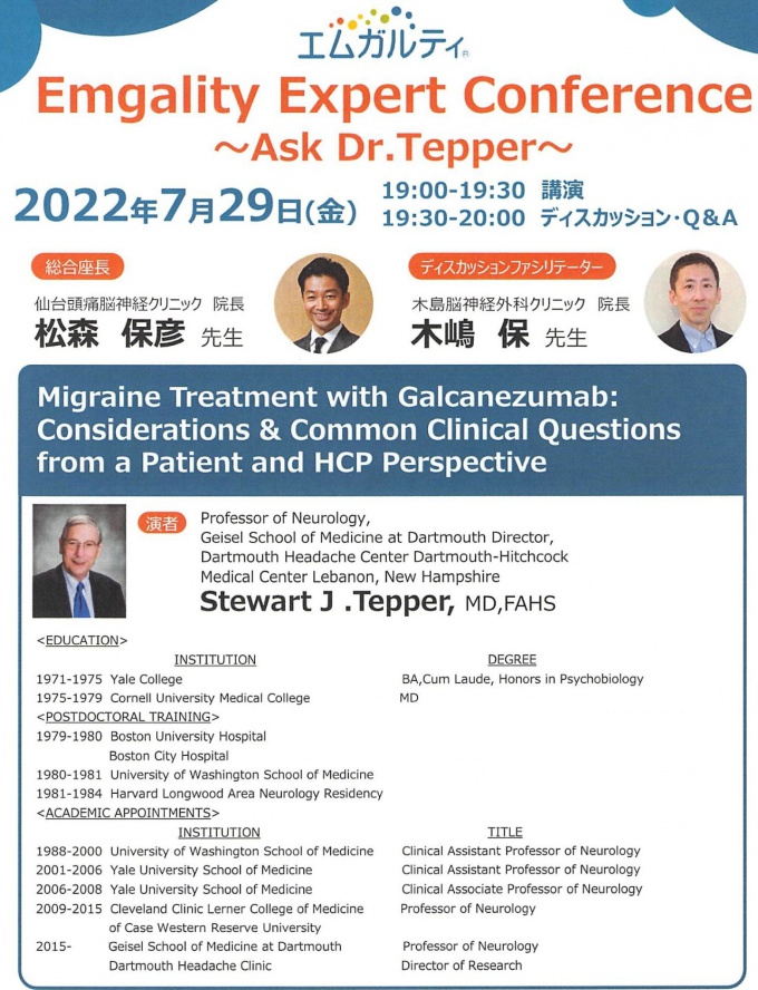 2022年07月29日(金) アメリカの頭痛診療を学ぶ アメリカの頭痛診療の権威であるDr.Tepper先生の講演を聞きました。また、国内の頭痛エキスパートの先生方も交えてディスカッションしました。アメリカではCGRP関連抗体薬は長期的に使用され、効果が出ているようです。CGRP関連抗体薬の自己注射も99%以上普及しており、安全に投与できる方法とのことでした。保険制度の違いはあり、全てをマネすることは出来ませんが、参考になることも多く、明日からの診療に生かしていきます。