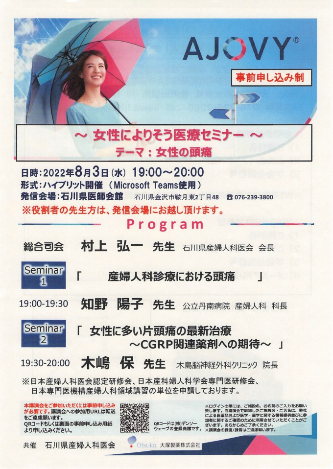 2022年08月04日(木) 産婦人科医会で頭痛の講演 石川県産婦人科医会で頭痛の講演をさせて頂きました。 生理に伴う頭痛で産婦人科を受診する患者さんも多いですが、生理に伴う頭痛の6割は片頭痛と言われています。 生理に伴う頭痛は片頭痛の治療で改善します。 産婦人科でも治療でも改善しない時は、頭痛専門医へ受診をお勧めします。