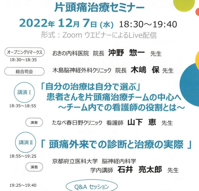 看護師の山下先生からは、看護師の立場として頭痛診療への取組み、診療の効率化について話があり、頭痛診療への意識の高さに驚きました。また、石井先生からは片頭痛診断、薬物乱用頭痛の治療のポイント、アメリカでの研究成果についてお話を伺いました。