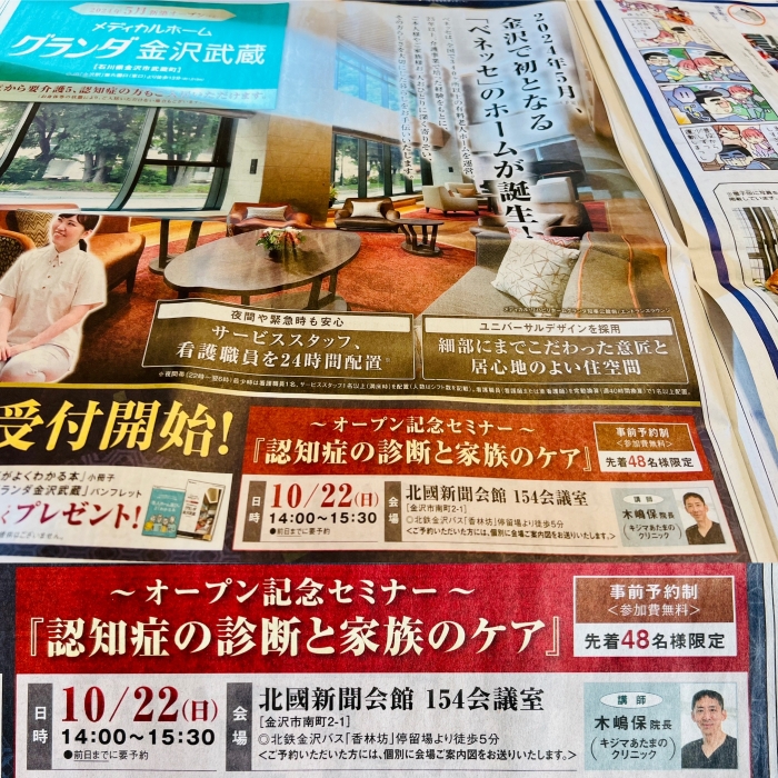 2023年10月07日(土) オープン記念セミナーで講演します! ベネッセが金沢で初となるメディカルホームをオープンさせます。そのオープン記念講演をすることになりました。今朝の北國新聞に掲載されました。先着48名ですが、興味がある方は是非おこしください。