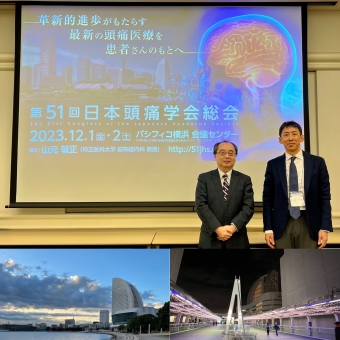 2023年12月01日(金) 日本頭痛学会で演題発表と座長をしてきました! 横浜で開催された第51回日本頭痛学会に参加してきました。今回は一般演題の発表と座長を務めてきました。演題発表は「CGRP関連抗体薬の在宅自己注射の現状」について、当院でのデーターを中心に話をしてきました。また、聖マリアンナ医科大学 脳神経内科 秋山教授と座長をさせて頂きました。 日頃、WEBでしかお会いできない先生方と直接話ができ有意義な学会でした。