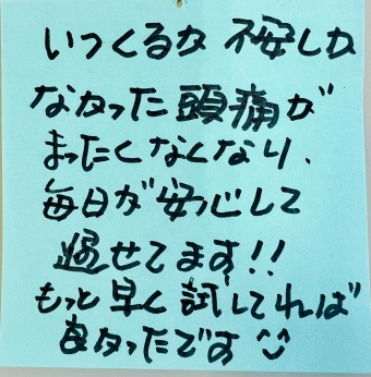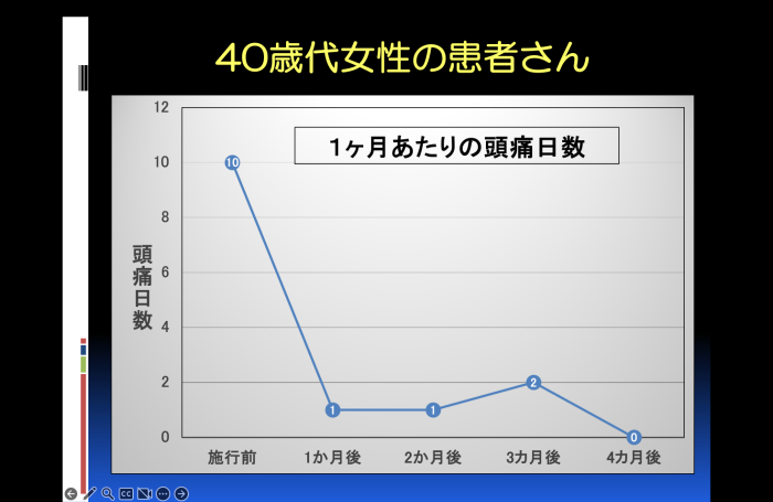 注射して1ヶ月後に来院されましたが、診察室に入るなり、「頭痛も1回しかなかく、すごく調子良いです!」と言われました。