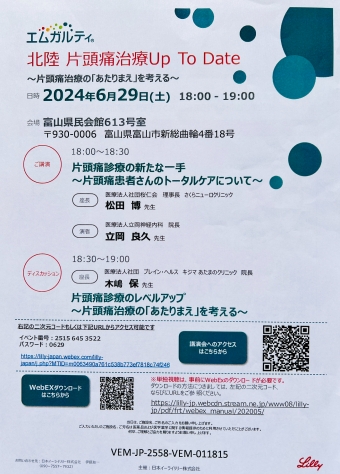 2024年06月30日(日) 週末は連日頭痛セミナー 土曜日は18時から富山で開催された頭痛セミナーで座長を行い、その後、富山から北陸新幹線で東京に向かいました。22時に東京に着き、日曜日の朝から頭痛セミナーに参加しました。 まだまだ頭痛で悩んでいる患者さんに最新の頭痛治療薬が届いていない状況であるとのことで、北陸においても頭痛診療のレベルアップを目指して、頭痛診療に関わる医師、医療従事者への勉強会、患者さんへの啓蒙活動を行なっていくことが大切だと改めた感じました。