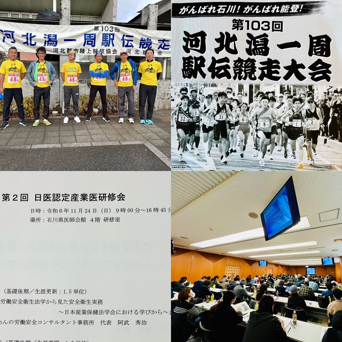 2024年11月24日(日) 駅伝応援&産業医研修 23日はクリニック前を発着地として、河北潟一周駅伝が開催されました。 今年は選手ではなく、監督としてサポートさせて頂きました。メンバーの激走から刺激を受け、トライアスロン練習へのモチベーションが高まりました。 24日は朝から夕方まで産業医研修に参加してきました。連休もゆっくり休めませんでしたが、体調管理に気をつけて頑張ります。