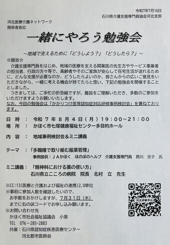 2025年08月04日(月) 一緒にやろう勉強会 8月4日(月)の夜、かほく市健康福祉センターで「一緒にやろう勉強会」が行われました! 今回は、 「多職種で取り組む服薬管理」 「精神科における薬の使い方(北村先生より)」 をテーマに、みんなで事例をもとに話し合い&ミニ講義 たくさんの医療・介護・福祉の仲間たちが集まり、 「どうしたらもっと安心して暮らせる支援ができる?」を一緒に考える熱い時間となりました! 印象に残った言葉は、 『その人を知ること、その人に興味をもつこと』 認知症ケアの基本、大事にしていきたいですね
