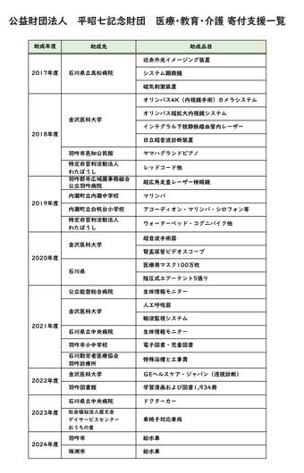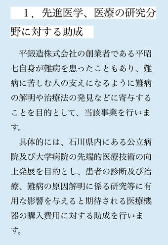 2025年09月01日(月) 「平昭七記念財団」の評議員に就任 このたび、平昭七記念財団の評議員を務めさせていただくことになりました。 平昭七氏は、東京で鍛造の技を磨き、故郷・石川県羽咋市で平鍛造株式会社を創業された孤高の技術者です。精密かつ強靭な鍛造リングを世に送り出し、日本の産業界に大きな足跡を残されました。 また晩年には、地域への寄付活動を通じて社会に尽くされ、その志は財団へと受け継がれています。 このたびご縁をいただき、地域医療や社会の発展に少しでも貢献できるよう努めて参ります。 どうぞよろしくお願いいたします。