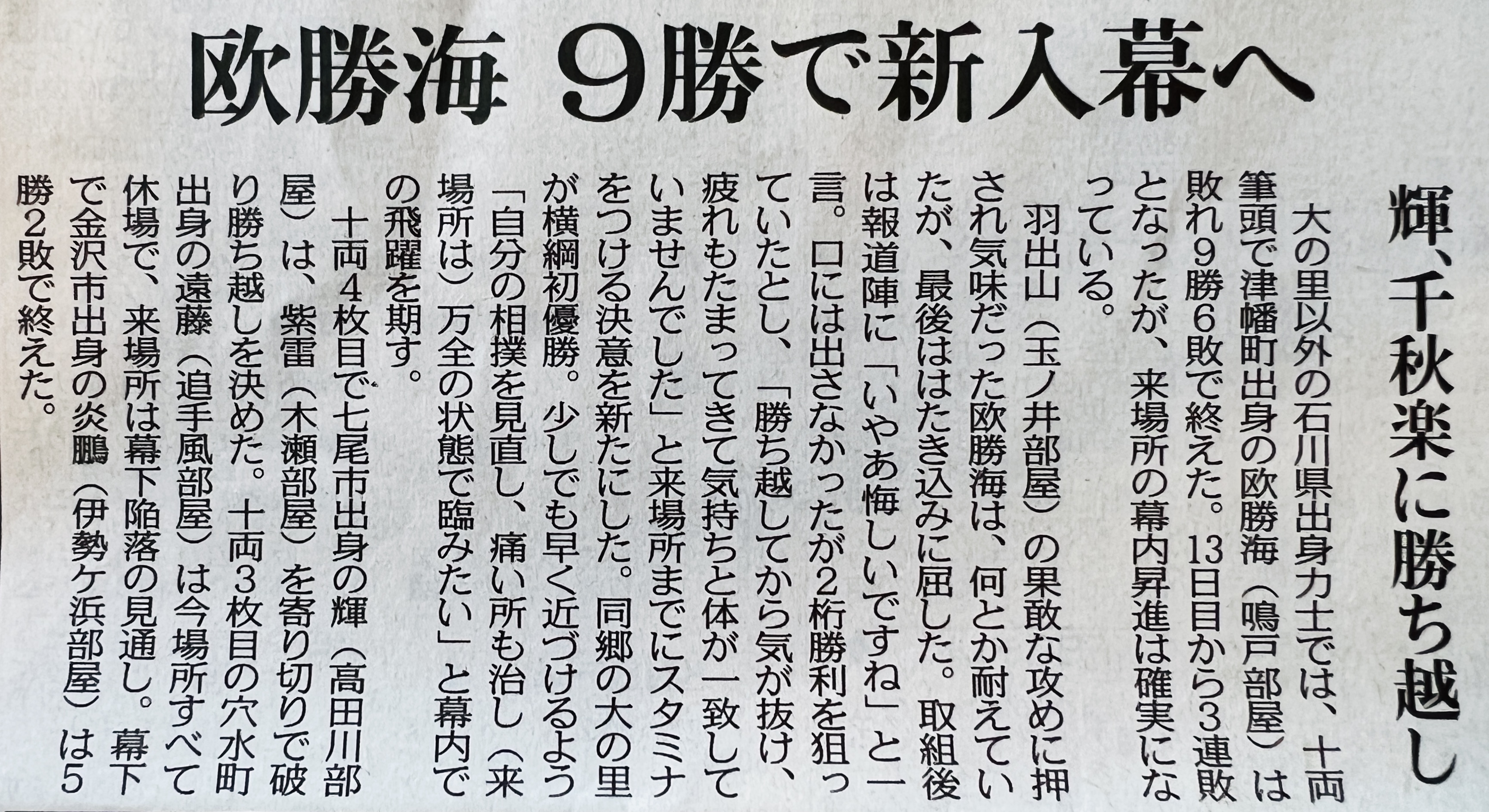 2025年09月29日(月) 相撲の町・津幡から快挙続々 大の里関 が横綱として初優勝! そして同じ津幡町出身の 欧勝海関 もついに 新入幕確実! ひとつの町から二人の力士が同時に大舞台へ―― これほど誇らしいことはありません。 津幡町はまさに「相撲の町」。 日本の相撲界を熱く盛り上げる二人を、 これからも全力で応援します!