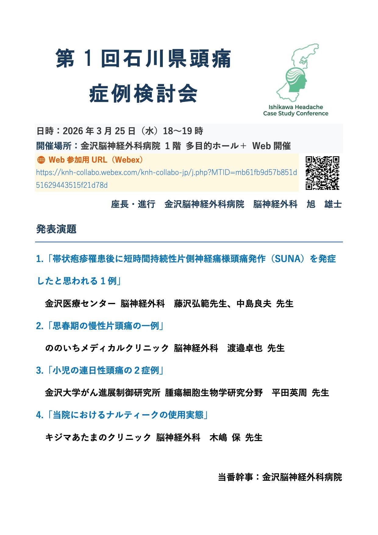 2026年03月25日(水) 第1回石川県頭痛症例検討会が開催 第1回石川県頭痛症例検討会を開催しました。 現地+オンラインで15名と適度な規模の中、 製薬企業の関与なく、自由に意見交換できる貴重な場となりました。 日常診療の悩みや迷いを率直に共有でき、 非常に有意義な時間でした。 石川県の頭痛診療の発展のために、今後もしていきたいと思います。