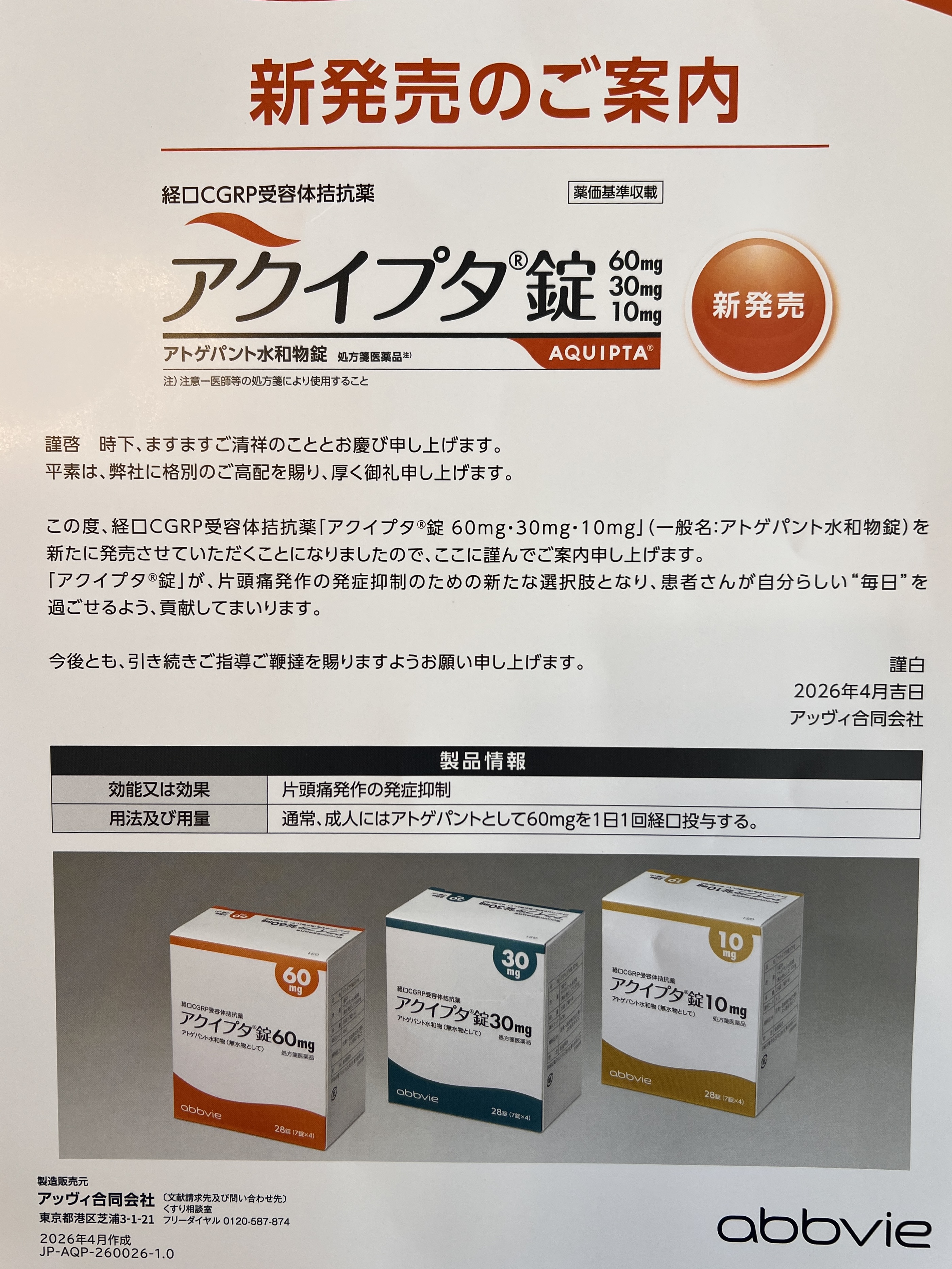2026年04月17日(金) 片頭痛予防治療の選択肢拡大 アクイプタ(atogepant)が国内承認・発売(2026年4月17日)。 CGRP関連治療の中でも経口投与という特性を踏まえ、アドヒアランスや患者背景を考慮した使い分けが重要と考えています。