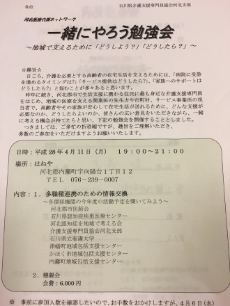 2016年04月11日(月) 一緒にやろう勉強会! 河北医療介護ネットワーク「一緒にやろう勉強会」に参加しました。 地域の開業医や各サービス事業所の担当者が集まり、情報交換をしてきました。 職種を超えて話し合うことでお互いに良い刺激となります! 写真は、河北中央病院長の寺崎先生や河北郡医師会長の由雄先生と。
