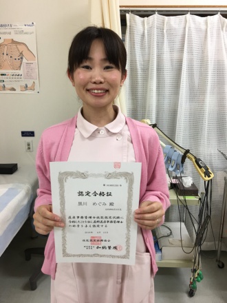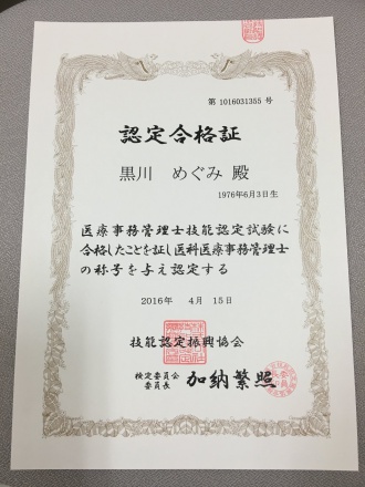 2016年04月21日(木) 合格おめでとう!! 当クリニックの受付スタッフの黒川さんが、医療事務資格試験に無事合格!! 1年前に入職した彼女は、医療関係の仕事は全くの未経験者でした。 しかしこの1年間、昼間は仕事をしながら、通信で学び資格試験に挑戦。 見事1回で合格できました。本当におめでとうヽ(´▽`)/ これからも自信持って、仕事してくださいね。