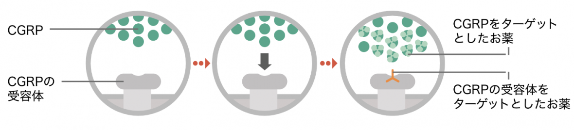 片頭痛は、脳内に「CGRP」という物質が増え、脳の血管に作用して起こるといわれています。近年開発されたCGRPをターゲットしたお薬は、CGRPのはたらきをおさえ、片頭痛発作が起こるのをおさえると考えられています。