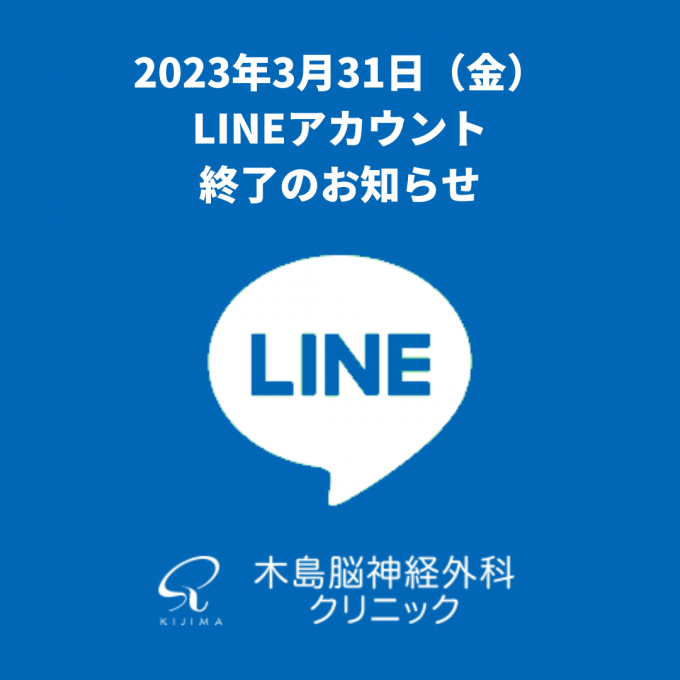 平素は格別のご高配を賜り厚く御礼申し上げます。さて、2021年3月31日(金)をもちまして木島脳神経外科クリニック LINEアカウント(@vnc4013g)を終了いたしますことお知らせいたします。
