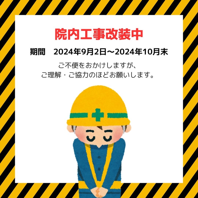 2024年09月03日(火) 改装工事のお知らせ 平素より当院をご利用いただき誠にありがとうございます。 このたび医療サービス向上のために院内の一部改装をおこないます。 改装工事期間(診察は通常通りおこないます) 2024年9月2日(月)〜2024年10月末 工事期間中は、騒音発生でご迷惑をおかけいたします。安全に十分注意し、工事をするよう努めてまりますので、何卒ご理解・ご協力いただけますようお願い申し上げます。
