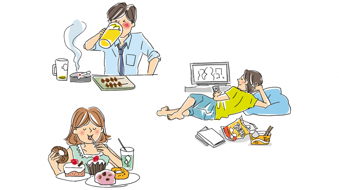 病気ではありませんが、肥満、運動不足、喫煙、多量飲酒(1日1合以上)、過労・ストレスの蓄積といった生活習慣の問題は、高血圧、糖尿病、高コレステロール血症などを引き起こし、また脱水や不整脈なども誘発します。このほか、遺伝的な体質、加齢なども脳卒中のリスクとされています。
